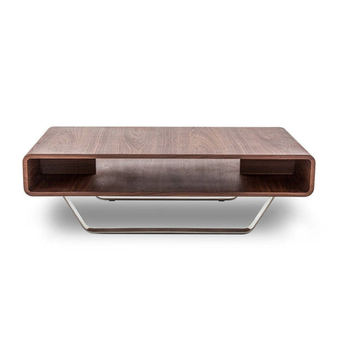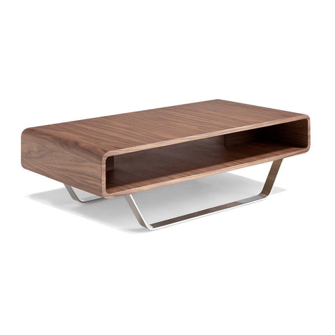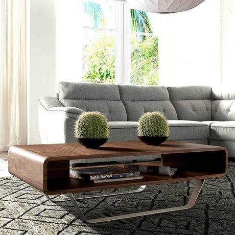 Mesa de centro con tapa de madera chapada en nogal y patas de acero inoxidable.