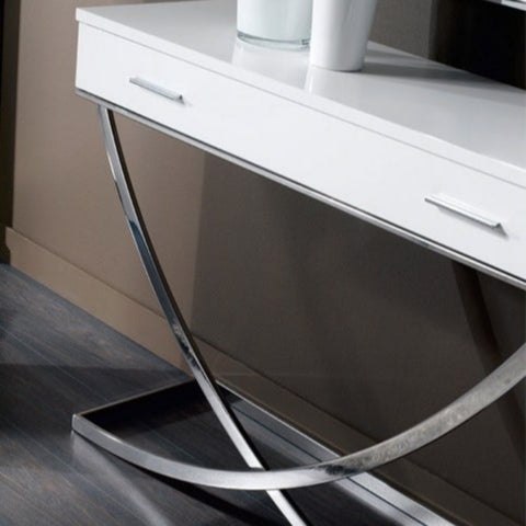 Este conjunto de entrada está compuesto por una consola en DM lacado brillo color blanco, que aporta elegancia y modernidad. La consola se complementa con una llamativa pata de acero inoxidable que aporta un toque de sofisticación y resistencia. El espejo, con un marco a juego, añade armonía y amplía la luminosidad del espacio, creando un ambiente equilibrado y estilizado.