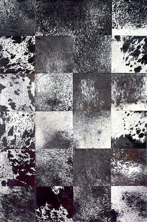 La alfombra Leather Patchwork dibujo A destaca por su sofisticada combinación de tonos negros, grises y blancos. Un diseño elegante y moderno que se adapta a cualquier ambiente contemporáneo. Su textura de pelito corto en piel natural de vaca ofrece un tacto suave y una estética exclusiva.