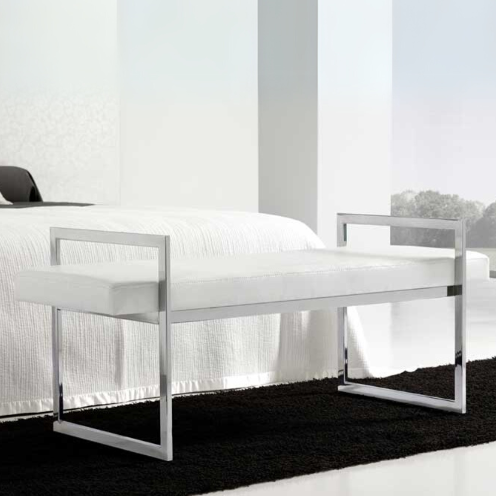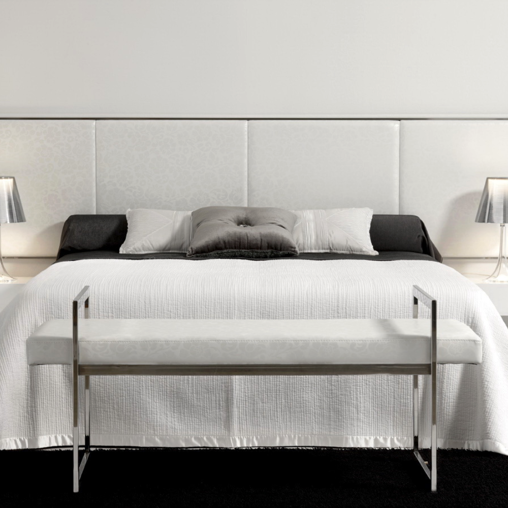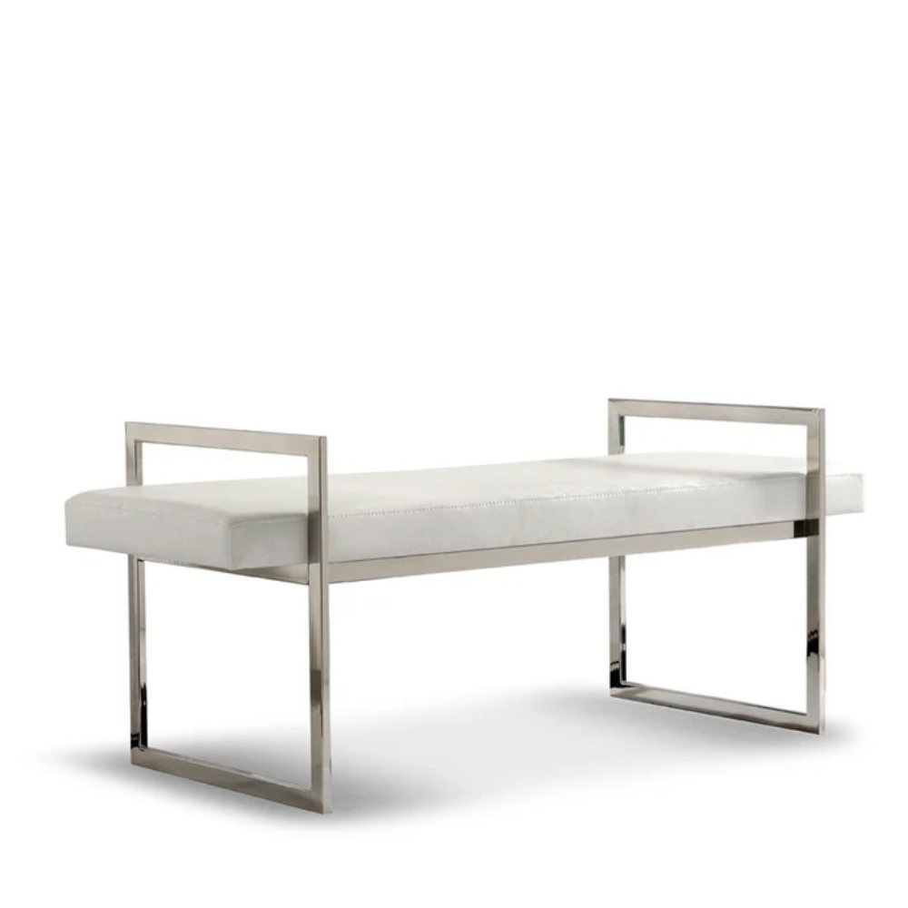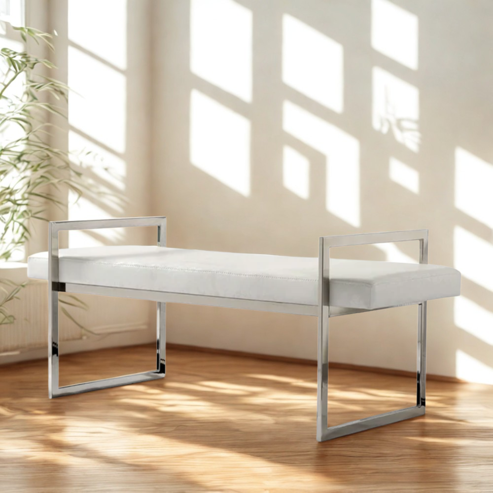 Esta banqueta descalzadora combina un diseño original y llamativo gracias a su base de acero inoxidable de líneas arquitectónicas, con una parte superior fabricada en piel sintética o tela antimanchas de altísima calidad. Es una pieza funcional y estilizada, perfecta para complementar cualquier espacio moderno con elegancia y confort.