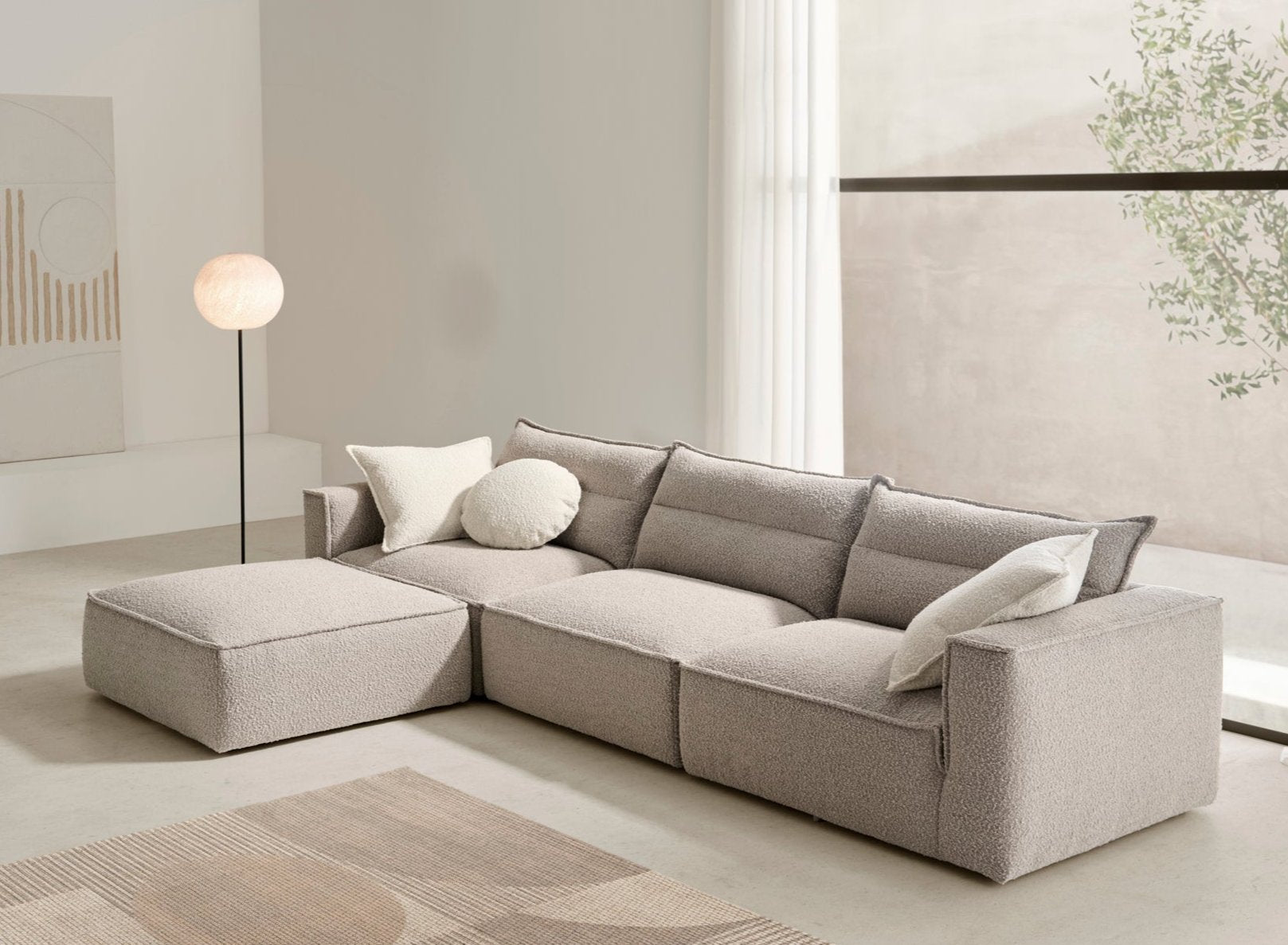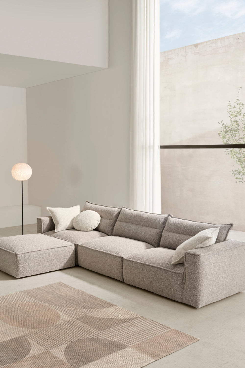 Chaisselongue partida de diseño modular y fondo reducido modelo HIPSTER en tejido bouclé