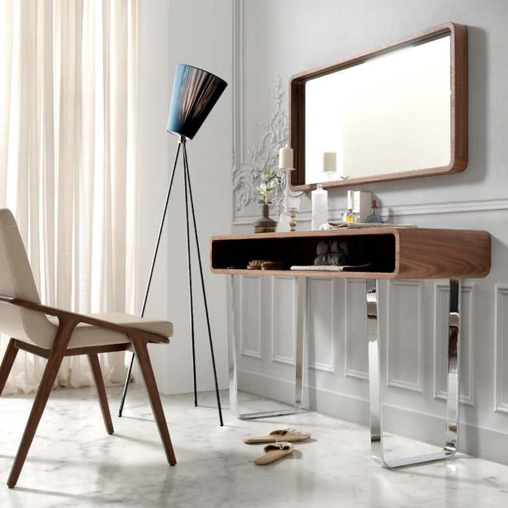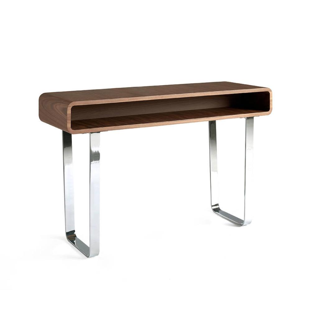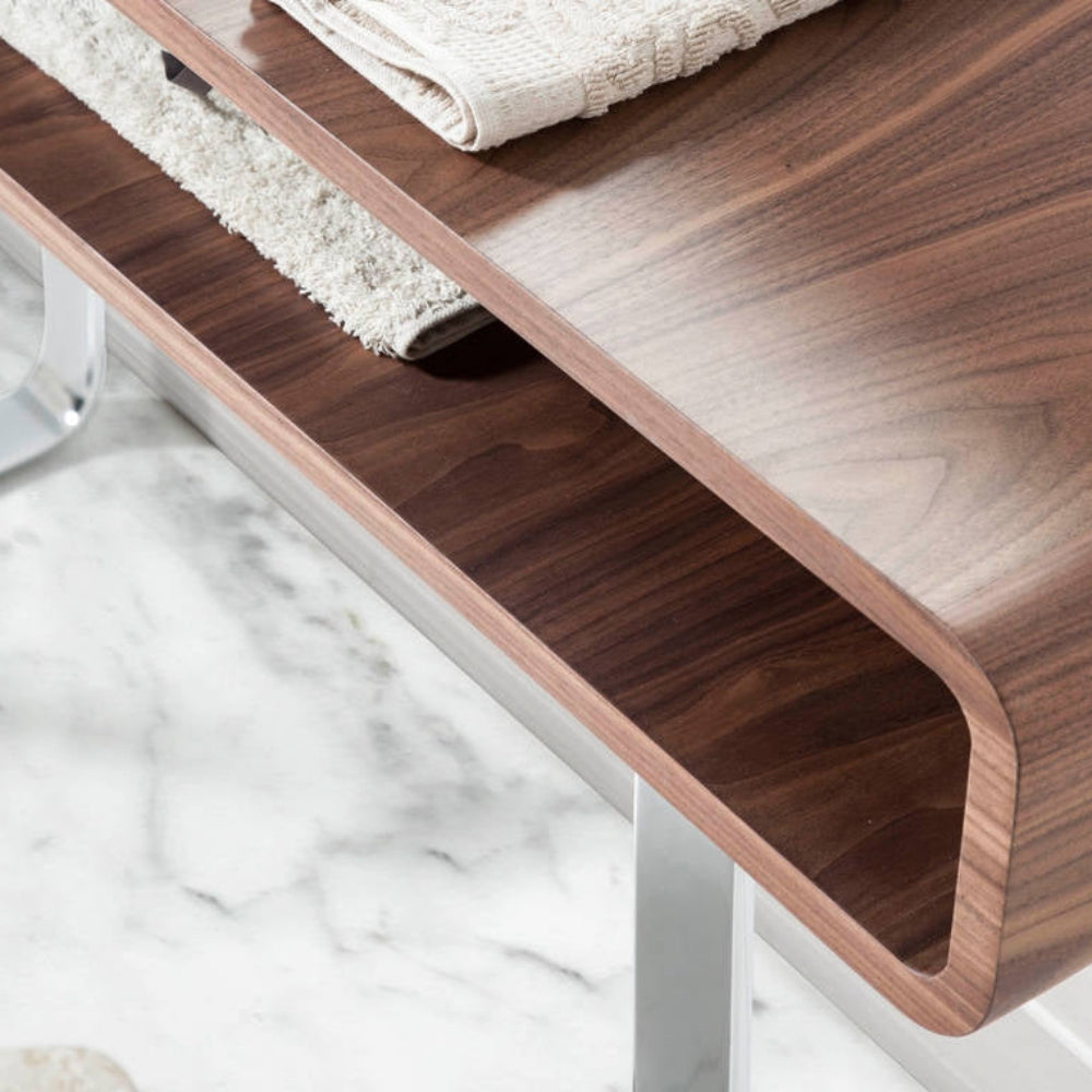 Consola elegante y moderna, fabricada con madera chapada en nogal y estructura de acero inoxidable, que aporta resistencia y durabilidad.