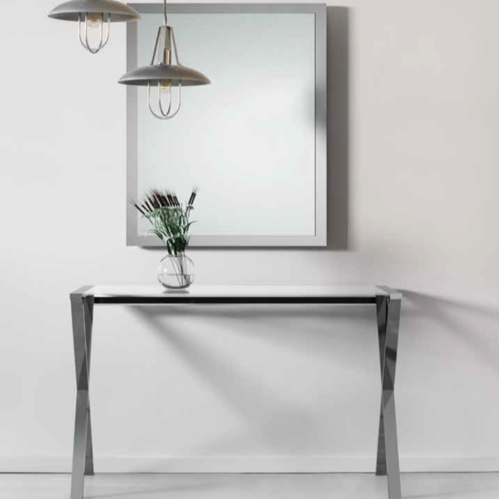 Conjunto de entrada de diseño moderno, que combina una estructura de acero inoxidable en forma de X con una elegante encimera de cristal lacado en negro. El espejo complementa perfectamente este conjunto con un marco en acero inoxidable y un detalle a juego en el lateral, añadiendo armonía y estilo a la pieza.