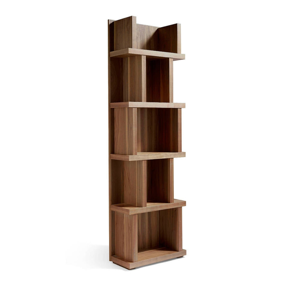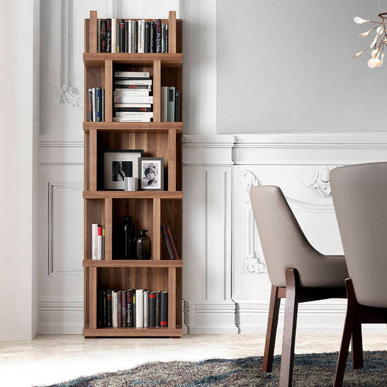 Estantería de diseño contemporáneo fabricada en madera chapada en nogal. Su estructura vertical y líneas limpias la convierten en una opción ideal para aprovechar al máximo cualquier pared con estilo y funcionalidad. Perfecta para aquellos que buscan aprovechar el espacio vertical sin comprometer el diseño.