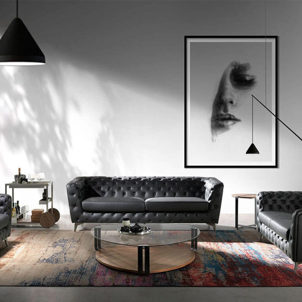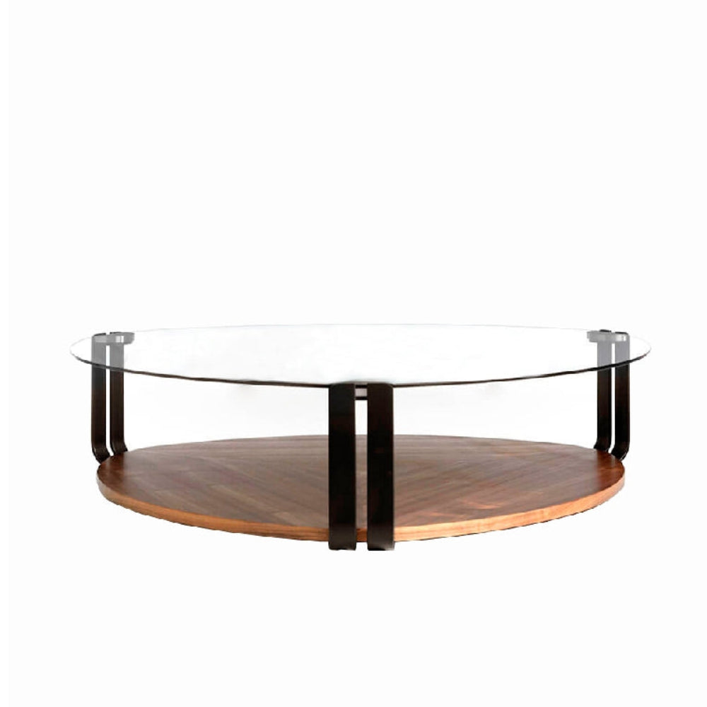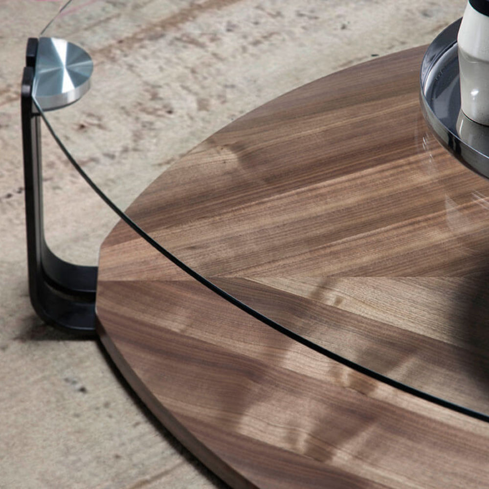 Tapa de cristal templado. Estructura compuesta de base de madera chapada en nogal natural de 0.5mm de espesor y patas en acero pintado en epoxi color negro.