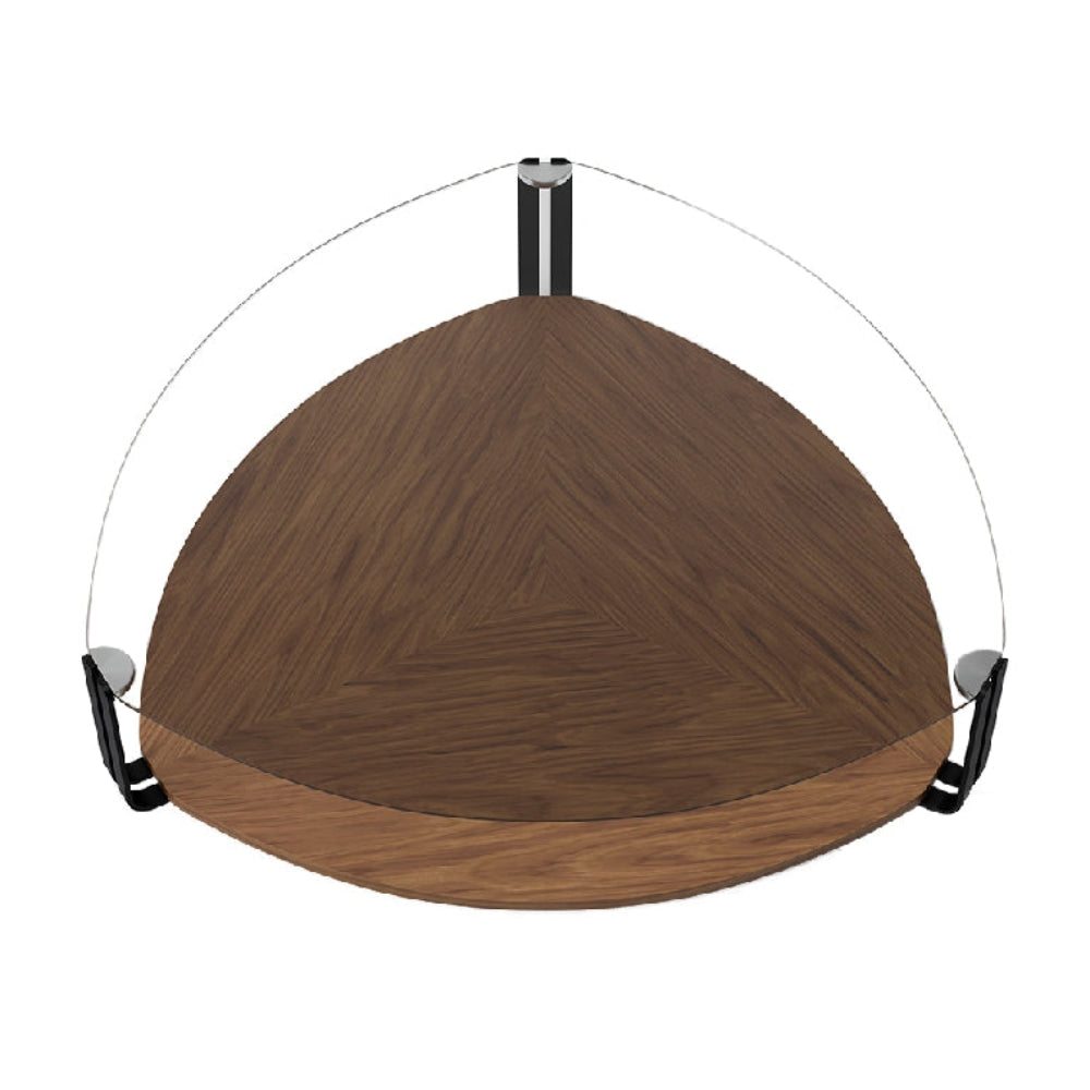 Esta original mesa centro triangular de cristal templado, madera chapada en nogal y acero negro es ideal para aportar ese toque moderno y de estilo a tu salón.