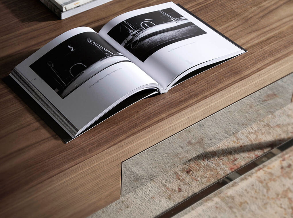 Tapa fija rectangular de madera chapada en nogal natural de 0,5mm de espesor con un cajón frontal acabado cromado y sistema de apertura push y cierre soft-closing, estructura de patas en acero inoxidable cromado de 22 micras.