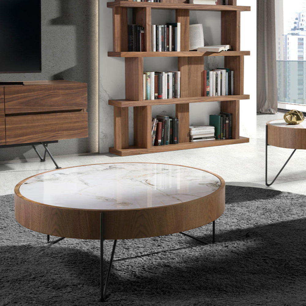 Mesa de centro redonda en mármol porcelánico y nogal – Diseño sofisticado