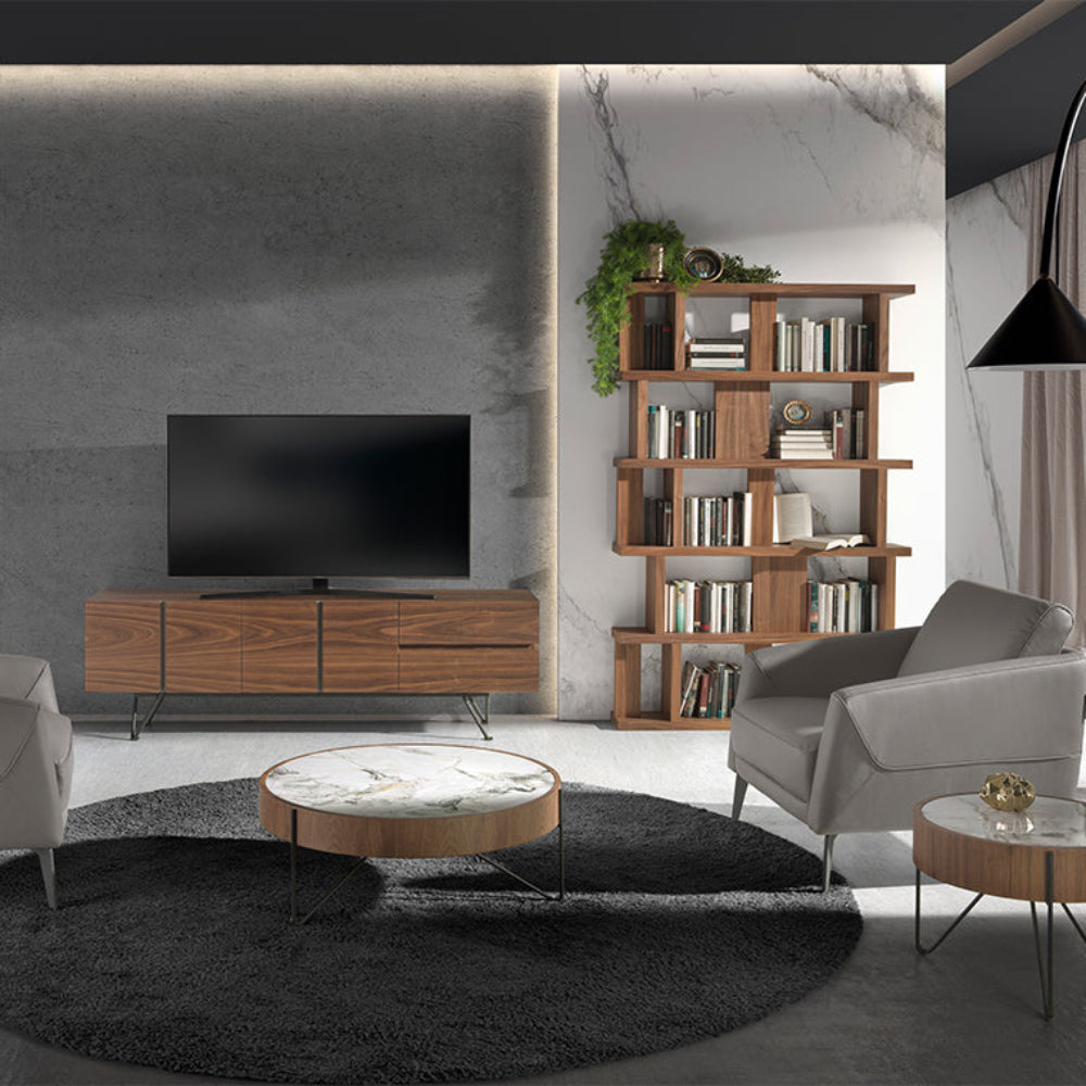 La mesa de centro circular de Sidivani combina la calidez de la madera chapada en nogal natural con la elegancia de una tapa de mármol porcelánico blanco. Sus vetas grises y marrones en acabado brillo aportan sofisticación y dinamismo visual, convirtiéndola en una pieza protagonista del salón.