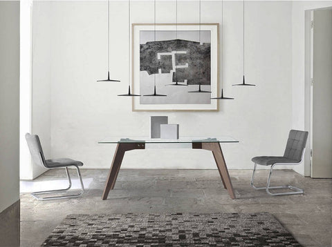 Elegancia, transparencia y diseño se combinan en esta mesa de comedor con tapa de cristal templado de más de 10 mm de grosor, sobre una estructura robusta en madera chapada en nogal. Su silueta recta y cuidada convierte cualquier comedor en un espacio sofisticado y actual.