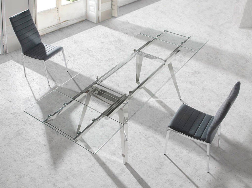 Esta mesa extensible de diseño es una solución versátil y sofisticada para comedores contemporáneos. Su tapa de cristal templado de 12 mm y sus patas en acero inoxidable crean un equilibrio visual entre transparencia, solidez y elegancia.