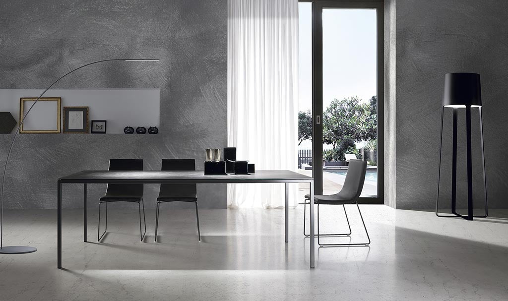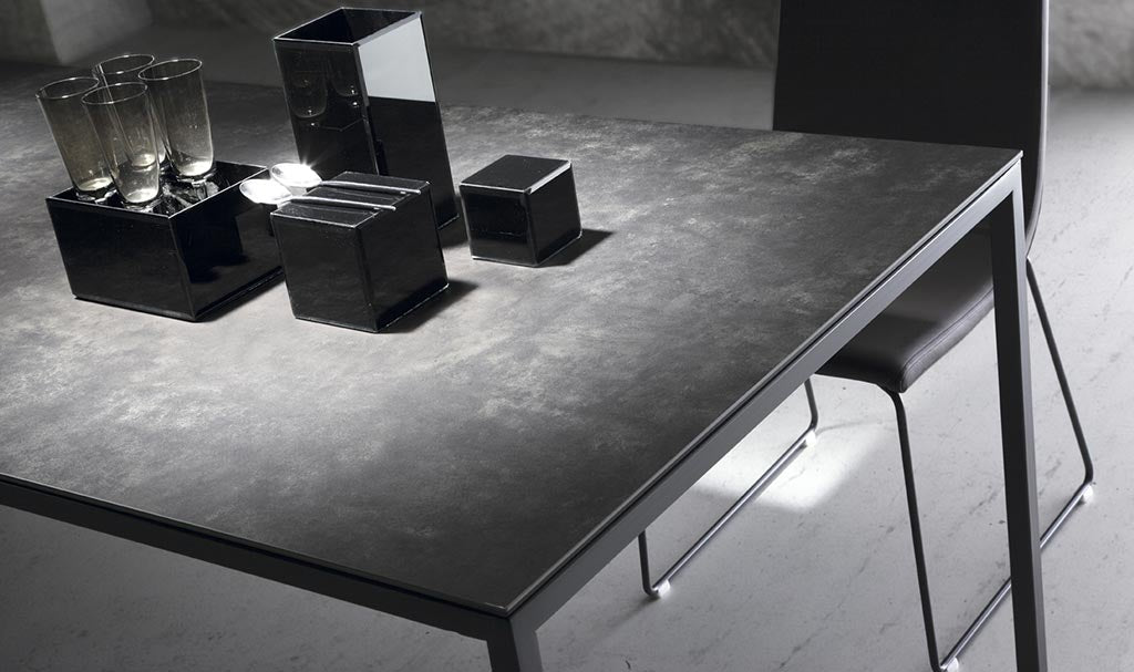 Mesa de diseño con tapa de cerámica color vulcano roca y patas de acero lacadas en negro. Opción de diferentes acabados.