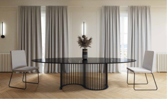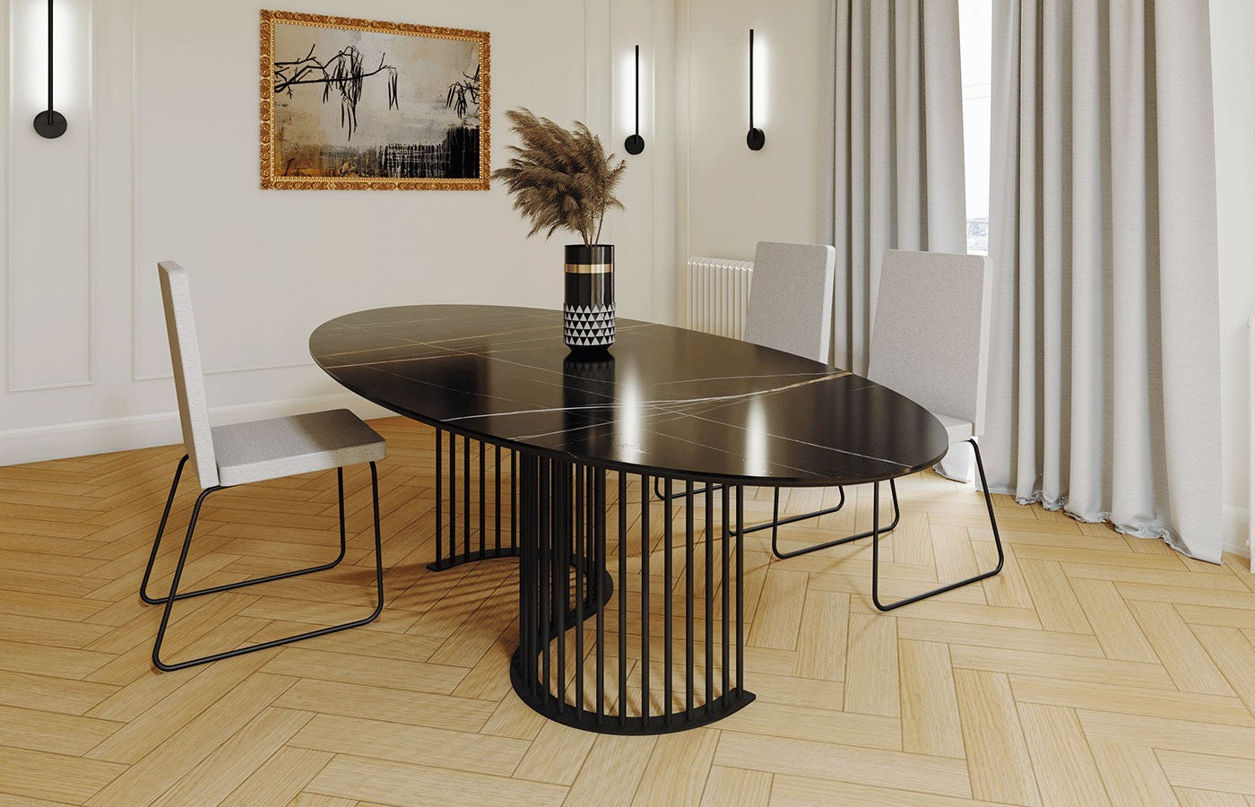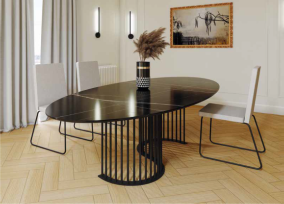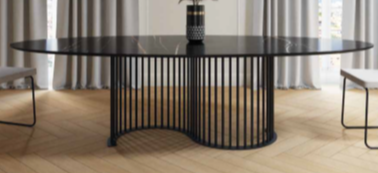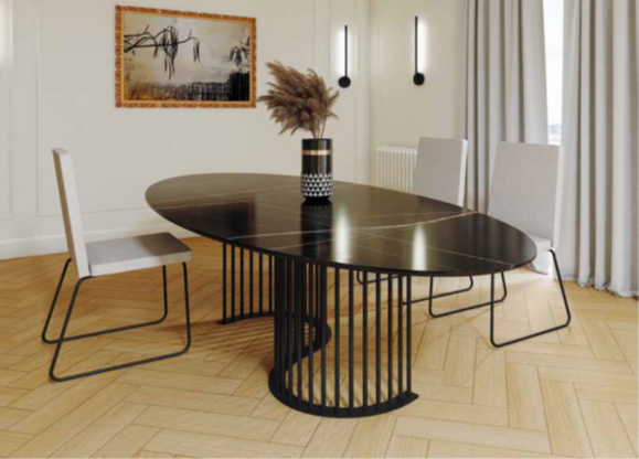 Mesa comedor de diseño oval modelo NILO con tapa cristal vitrificado , pie acabado negro mate.
