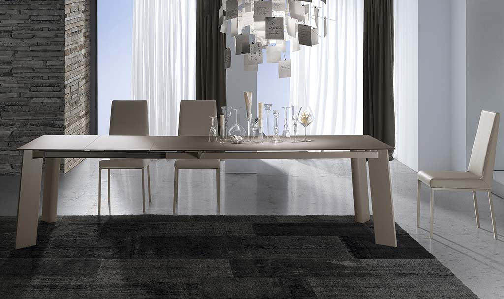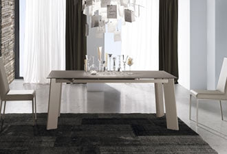 Mesa de diseño con tapa de vidrio natural color arena y patas de aluminio lacadas en color arena. Opción de diferentes acabados.