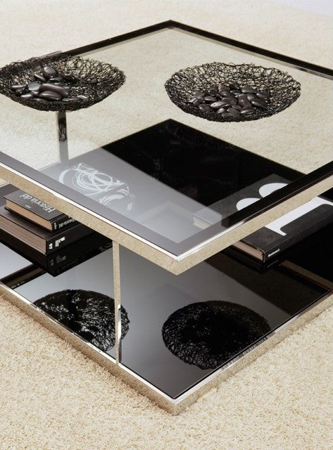 Esta mesa de centro combina una estructura de acero inoxidable con sobre de cristal templado, todo sobre una base lacada en negro (también disponible en color blanco). Una pieza versátil que puede elegirse en formato cuadrado o rectangular, adaptándose a diferentes estilos de salón.