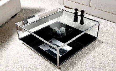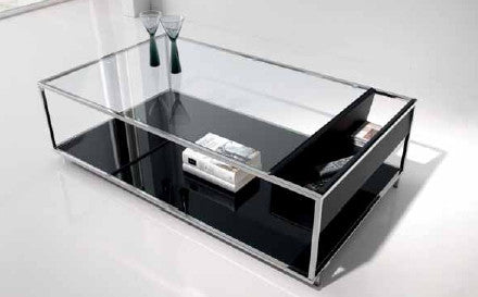 Estructura de acero inoxidable con tapa de cristal y base lacada en negro.