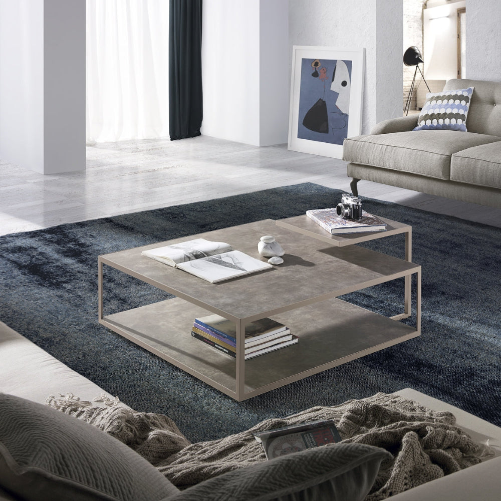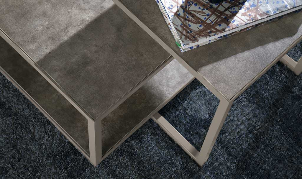 Mesa centro con estructura de acero angular calibrado lacada en visón y tapa de cerámica color vulcano ceniza.