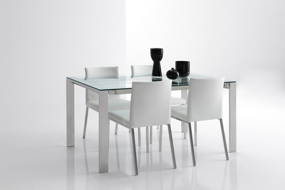Mesa de comedor con tapa de cristal templado de 10 mm. de grosor o DM lacado en blanco color brillo. Patas de acero inoxidable. Cuenta con un extensible de 50 cm oculto bajo la misma mesa.