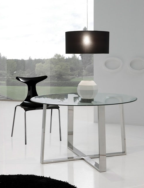 Mesa de comedor con tapa de cristal templado de 10 mm. de grosor y estructura de acero inoxidable pulido.