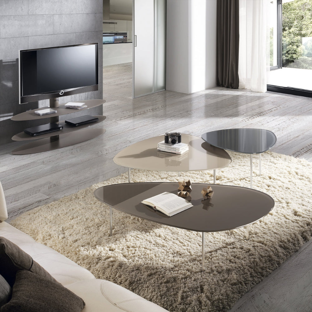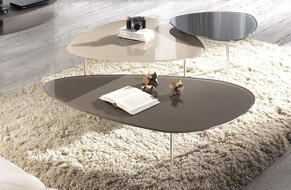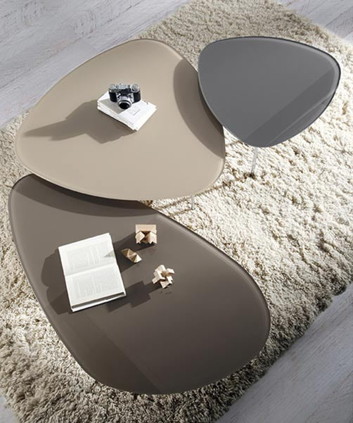 Actual conjunto de mesas de centro de diferentes tamaños y colores que podrás personalizar como quieras. Elaboradas en vidrio con diferentes colores a elegir y estructura de acero.