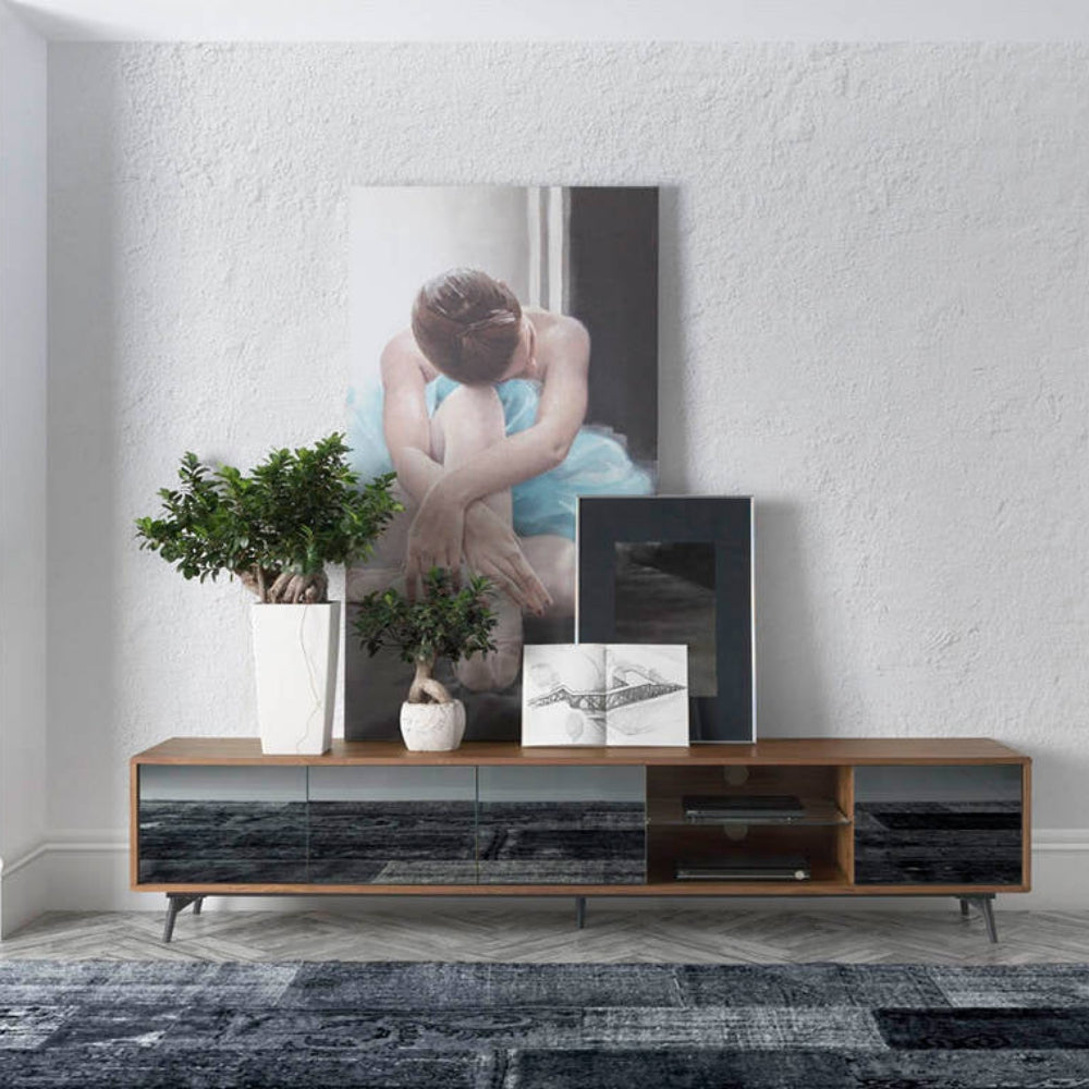 Esta composición para TV destaca por su elegancia contemporánea y su cuidada combinación de materiales nobles y acabados sofisticados. Fabricado en madera chapada en nogal o DM lacado, incorpora puertas con espejo gris que aportan profundidad y un sutil toque de brillo al espacio.