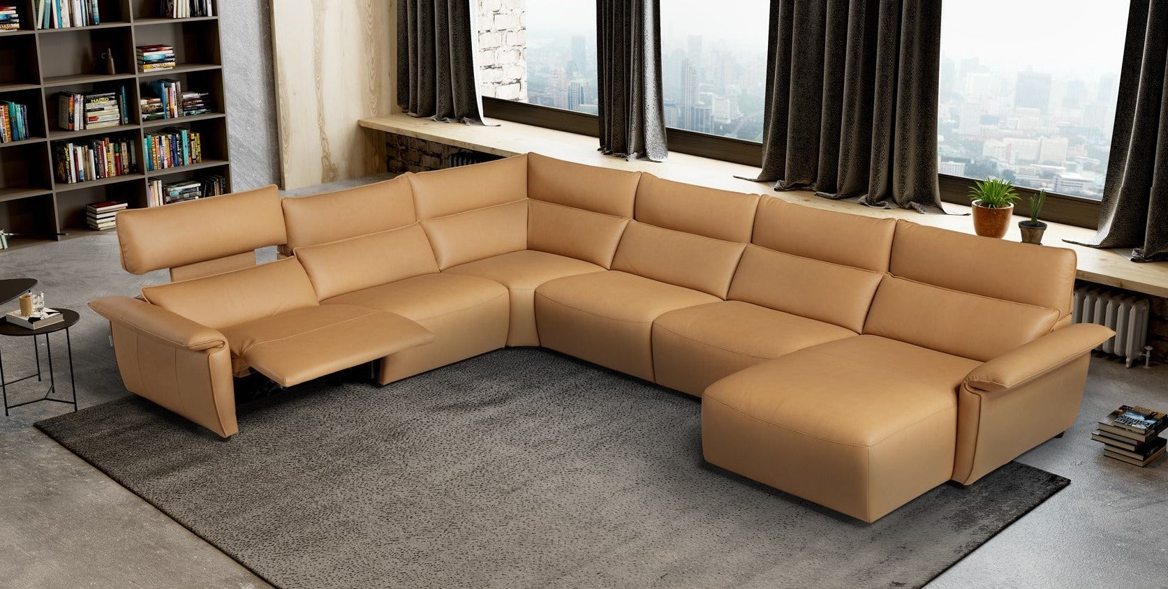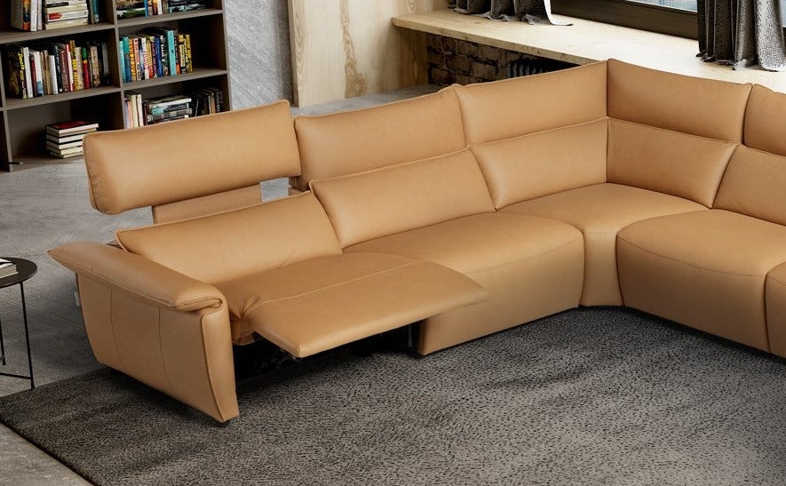 Rinconera de diseño con chaiselongue modelo PUGLIA con cabezal eléctrico ajustable y asiento relax en Piel.