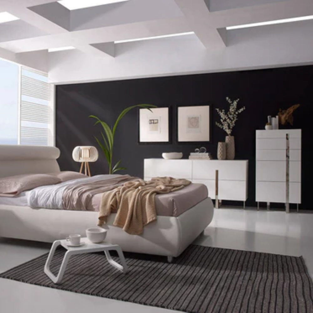 El sifonier de 5 cajones de la Colección Elegance es la elección ideal para dormitorios que buscan una estética moderna, refinada y funcional. Fabricado en DM lacado en blanco, este mueble destaca por su diseño limpio y minimalista, potenciado por sus estilizadas patas de acero inoxidable, que aportan ligereza visual y sofisticación.