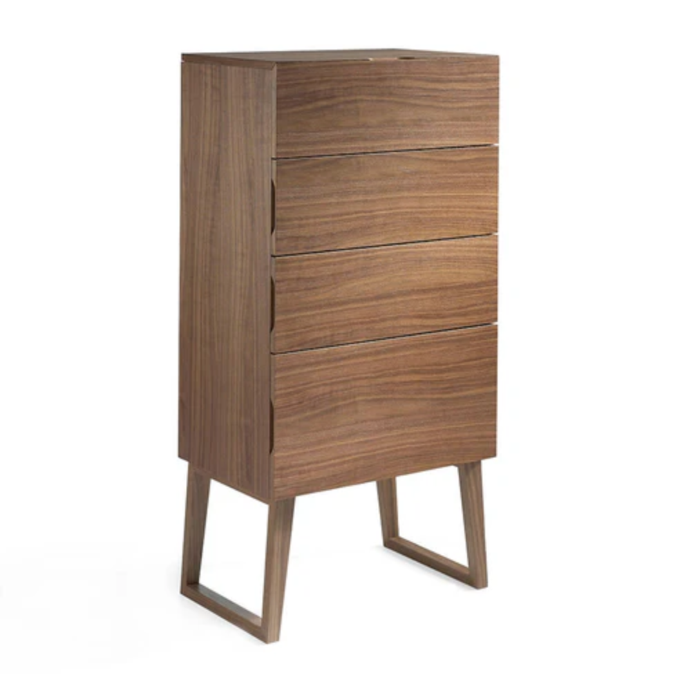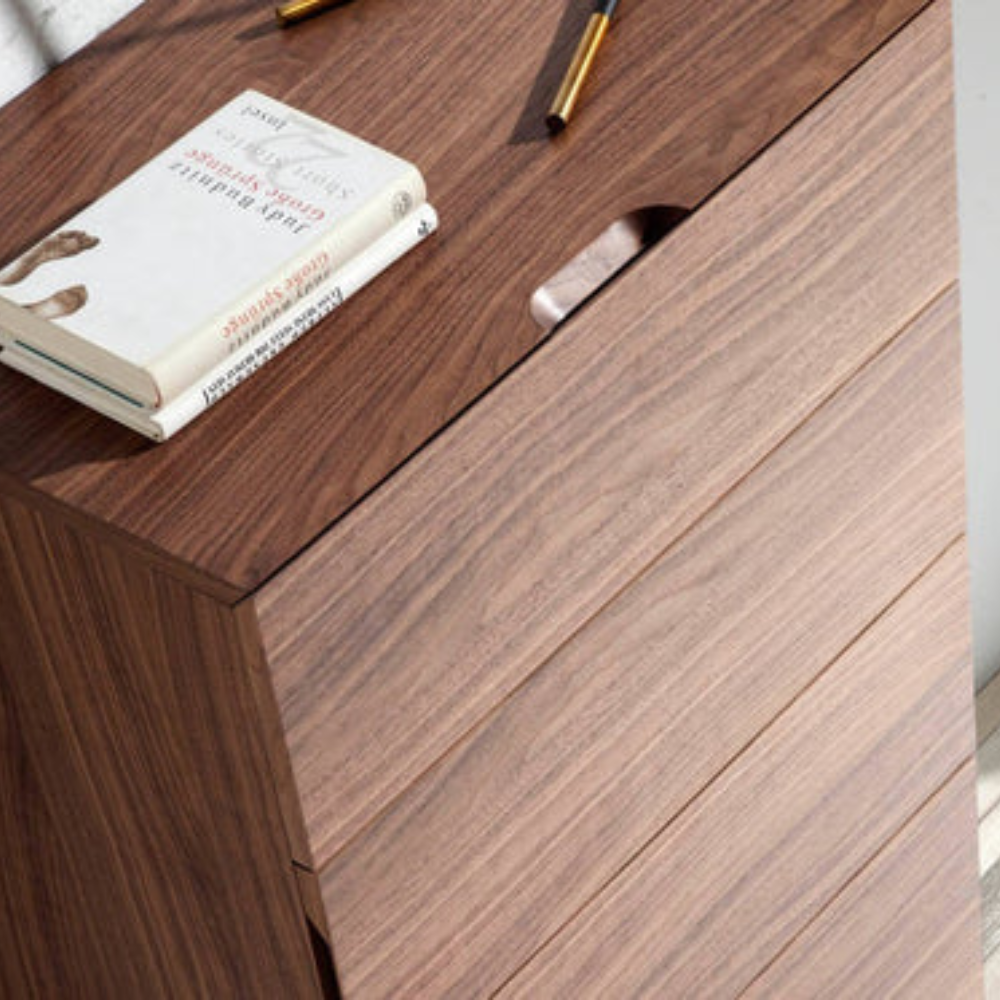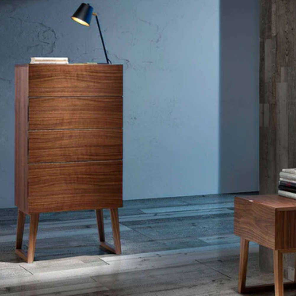 La calidez natural de la madera y el diseño contemporáneo se unen en este elegante sifonier de 4 cajones de la Colección Elegance. Su acabado en chapado en nogal convierte cualquier dormitorio en un espacio con alma, estilo y funcionalidad.